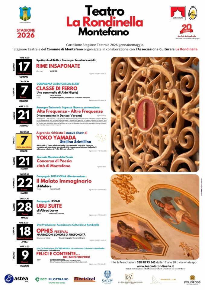 La gestione del cartellone del Teatro di Montefano rappresenta una delle attività principali dell’associazione, spaziando dalla commedia classica all’attualità, fino alla produzione e alla promozione di spettacoli indipendenti.